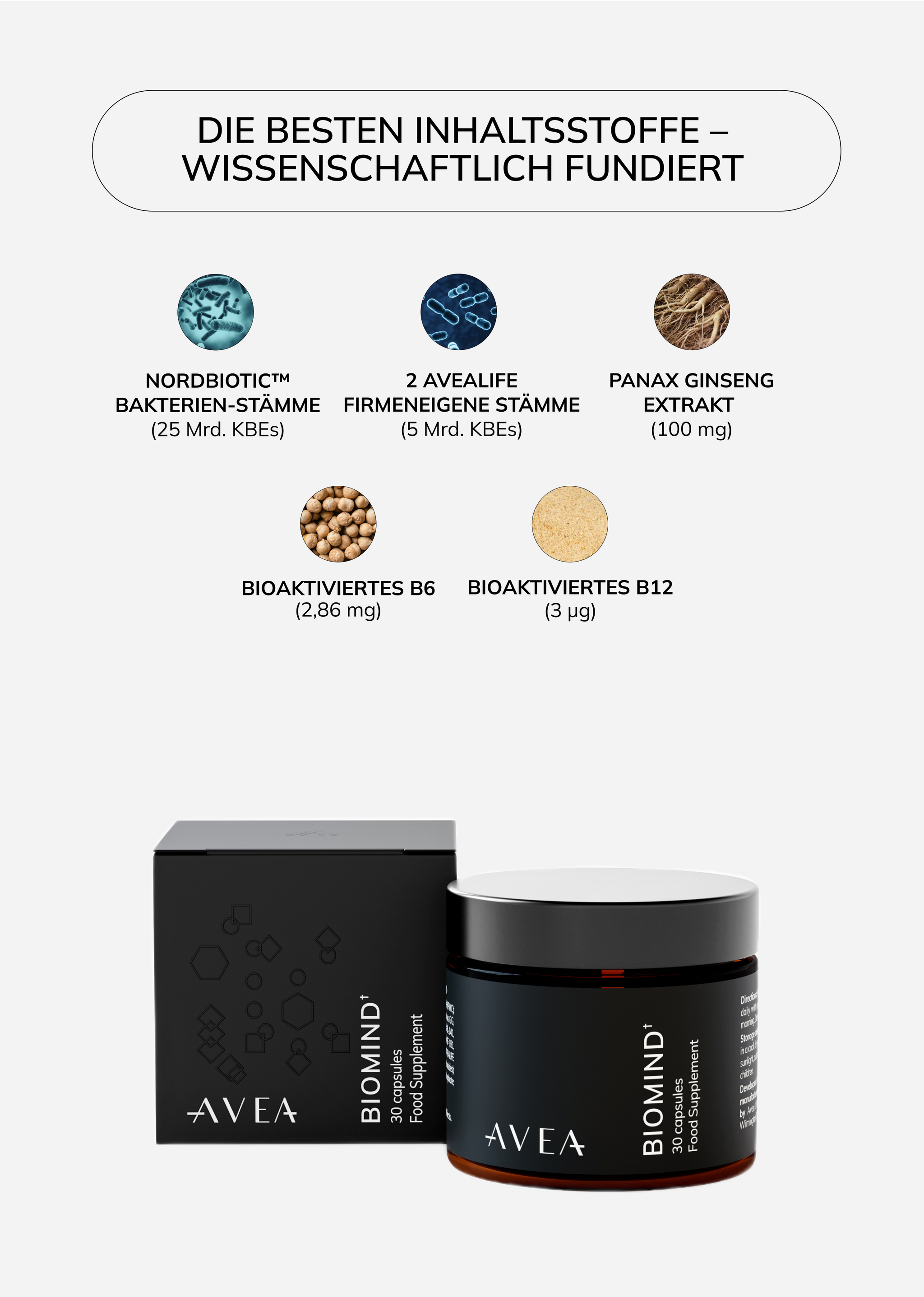 Biomind wurde gemeinsam mit führenden Longevity- und Mikrobiom-Forschenden aus der Schweiz und Dänemark entwickelt und enthält neuartige, patentierte Bakterienstämme.