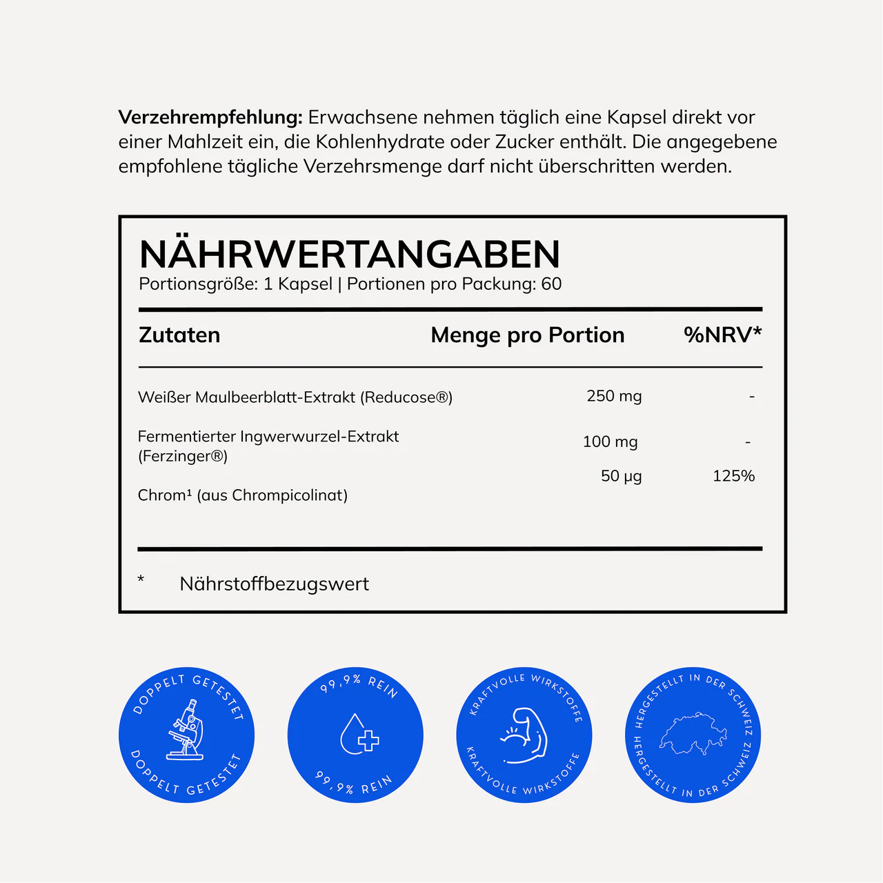 Die Formel vereint die besten Inhaltsstoffe aus der Natur: Den patentierten weißen Maulbeerblatt-Extrakt Reducose®, der innovative fermentierten Ingwerextrakt Ferzinger™ und das essentielle Spurenelement Chrom in seiner bioverfügbaren Form Chrompicolinat.